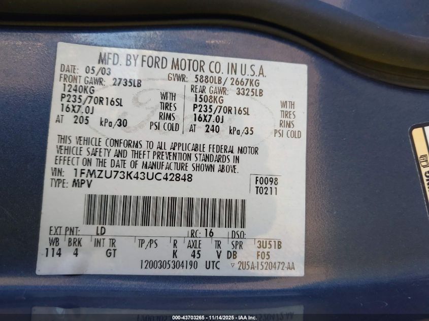 1FMZU73K43UC42848