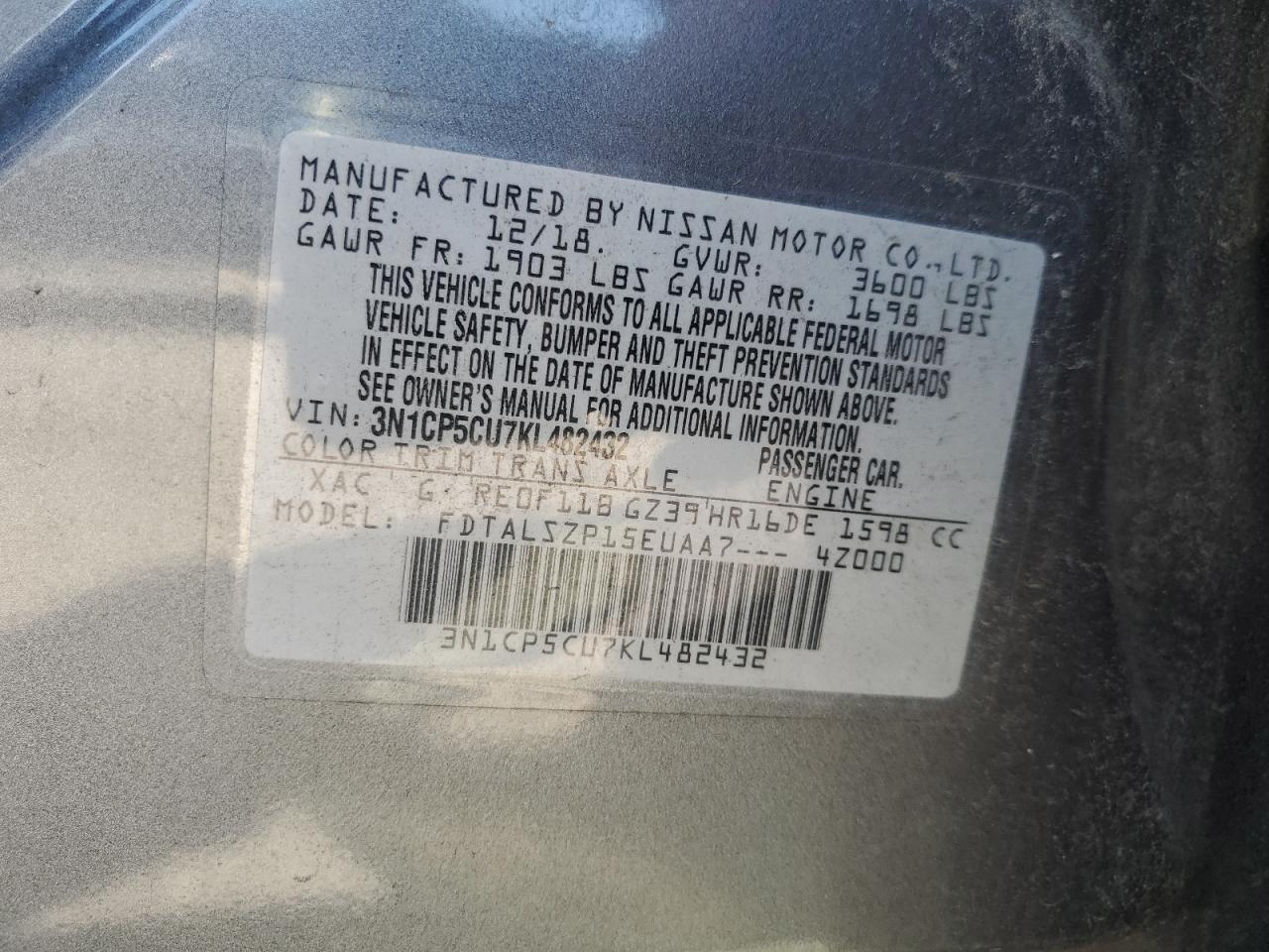 VIN: 3N1CP5CU7KL482432