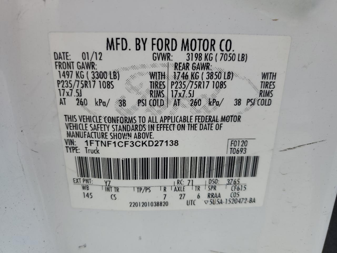 VIN: 1FTNF1CF3CKD27138