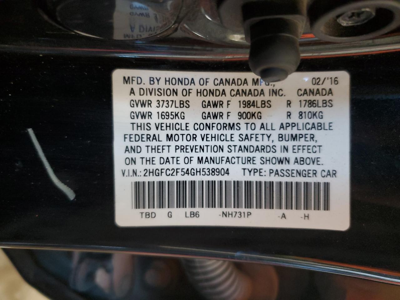 VIN: 2HGFC2F54GH538904