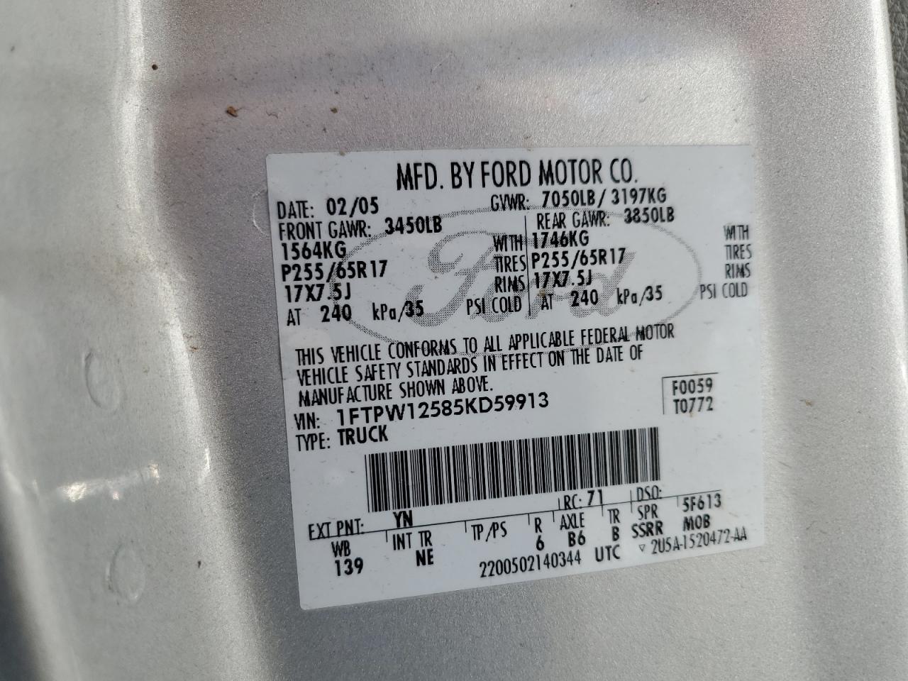 VIN: 1FTPW12585KD59913