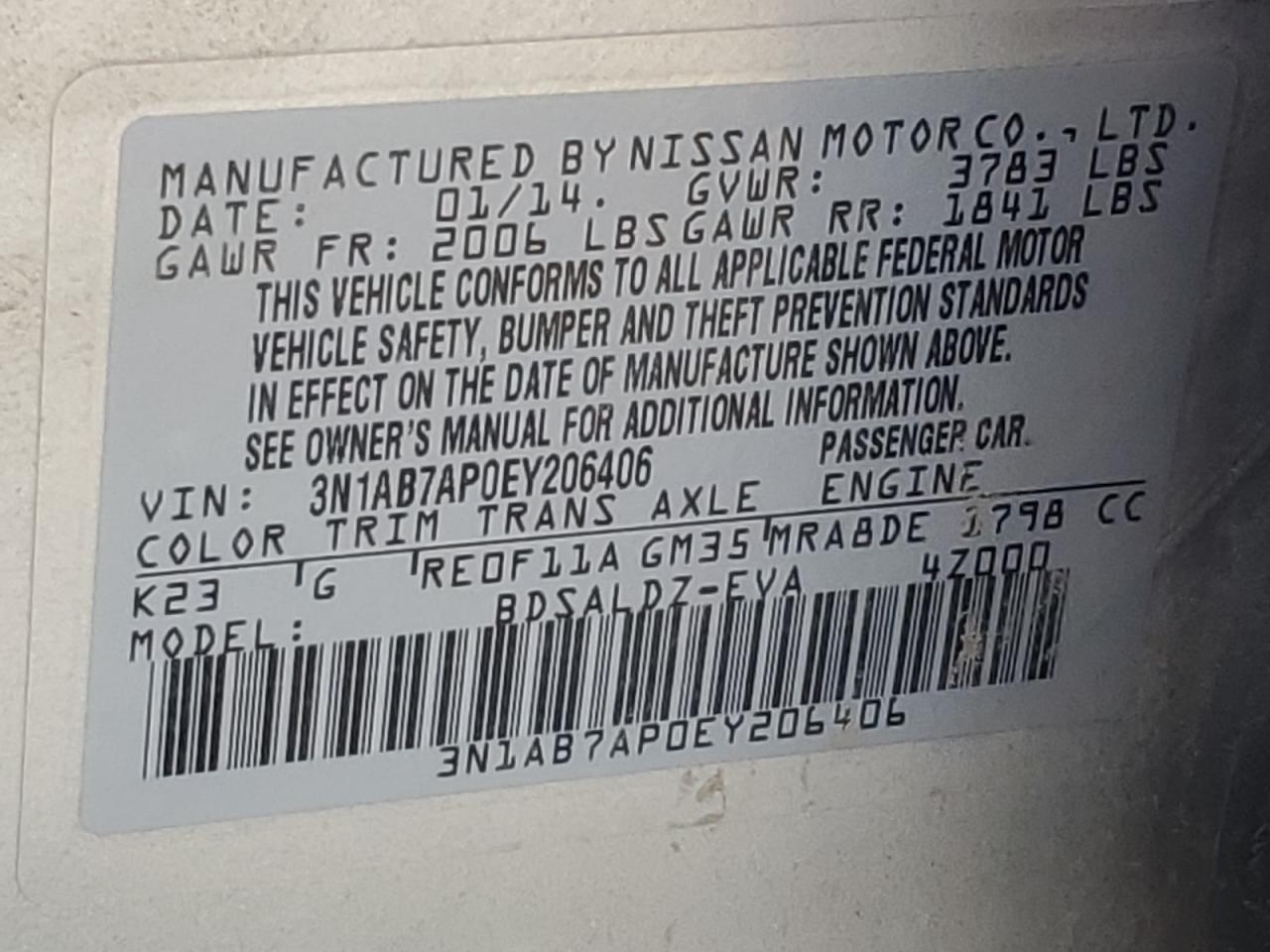VIN: 3N1AB7AP0EY206406