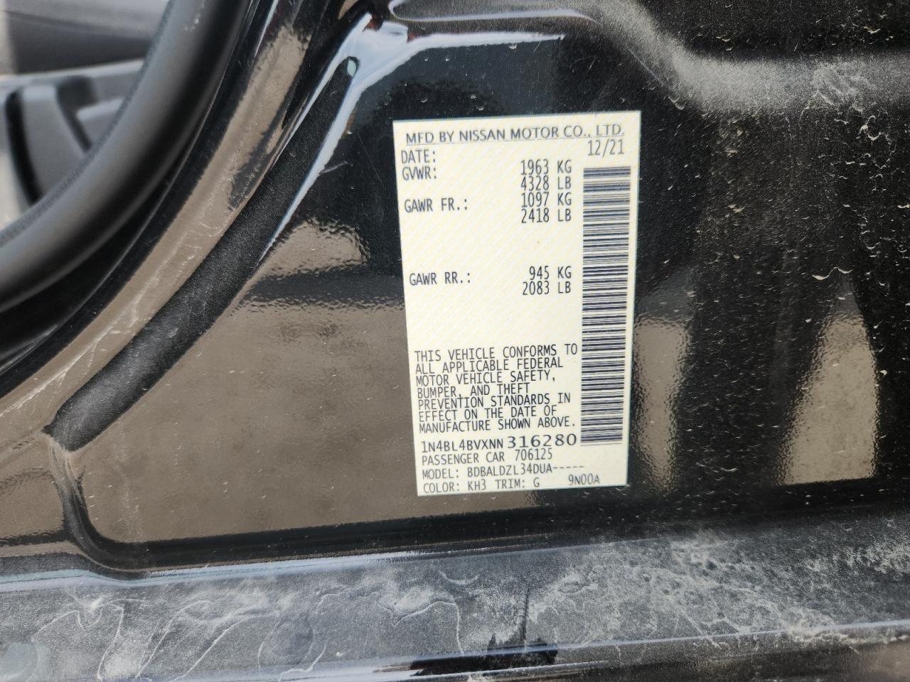 VIN: 1N4BL4BVXNN316280