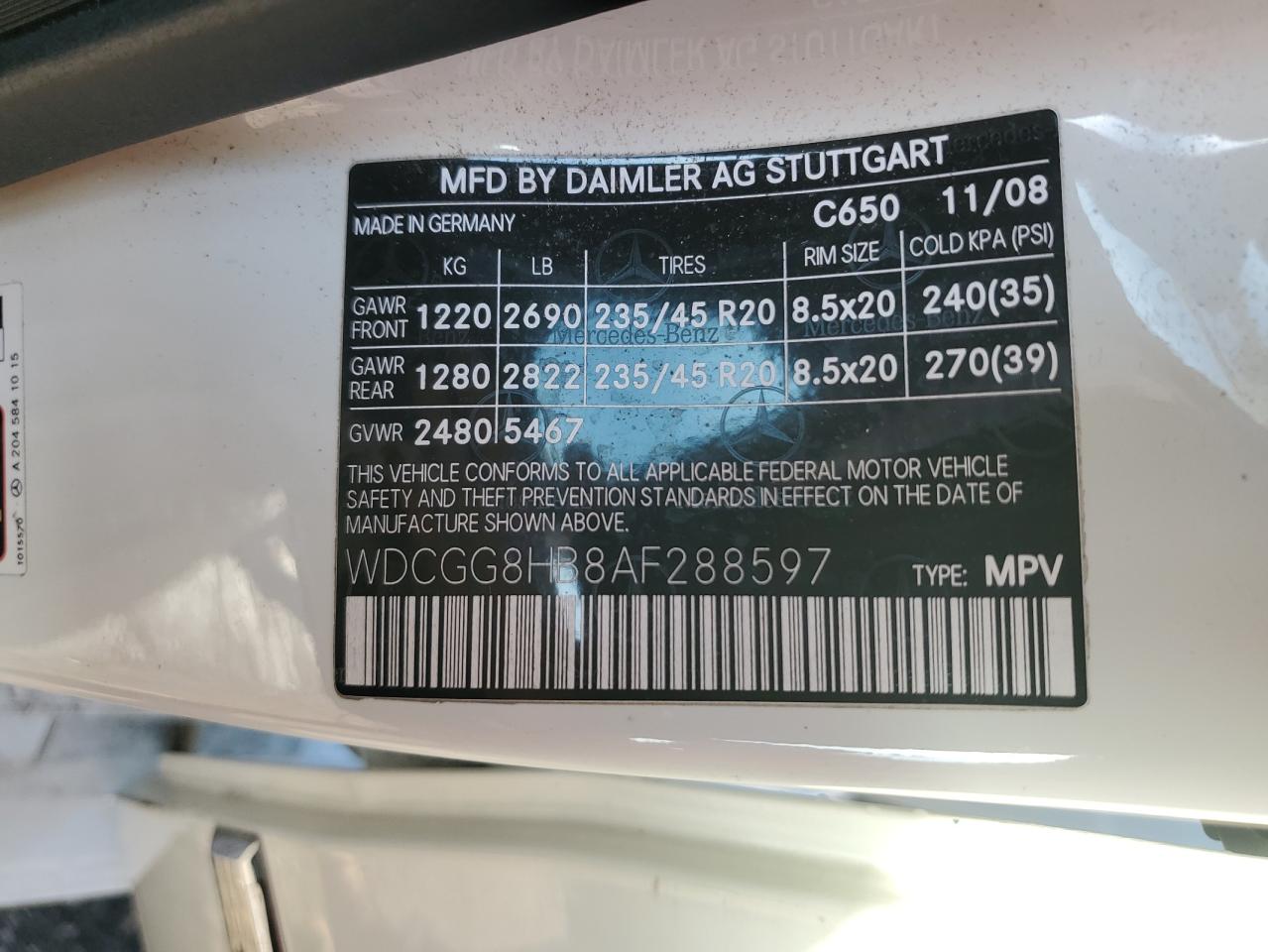 VIN: WDCGG8HB8AF288597