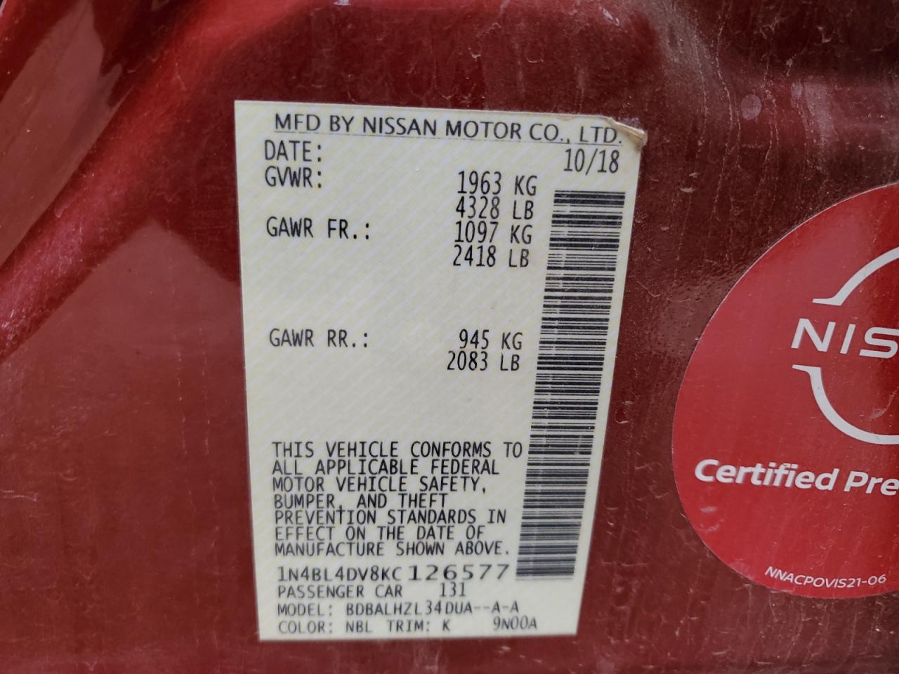 VIN: 1N4BL4DV8KC126577