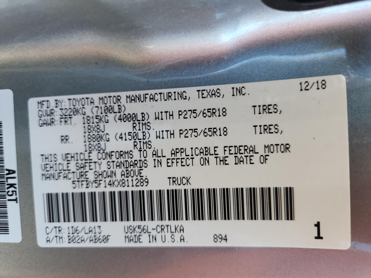 VIN: 5TFBY5F14KX811289
