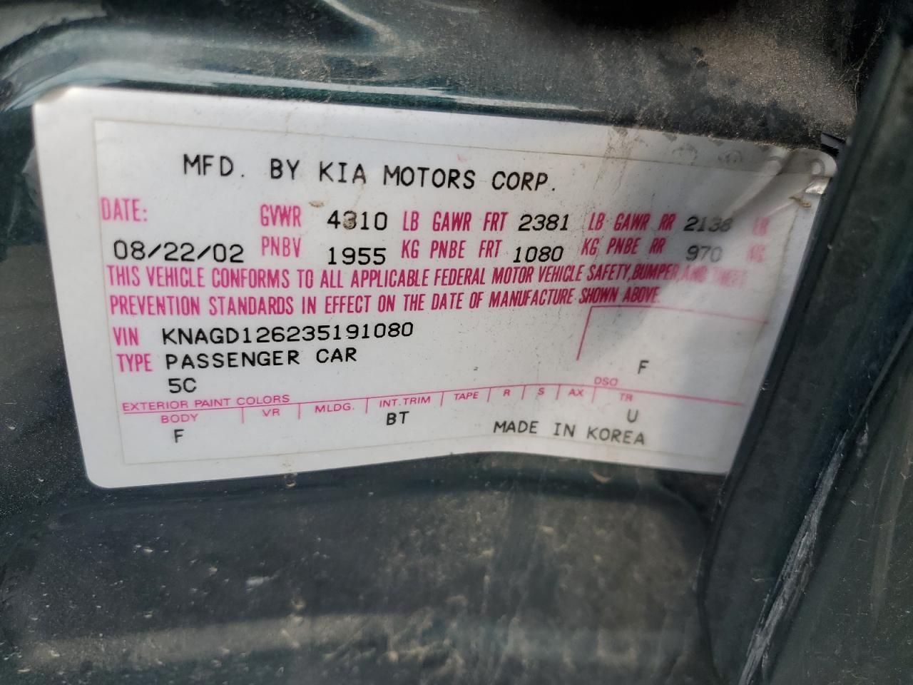 VIN: KNAGD126235191080