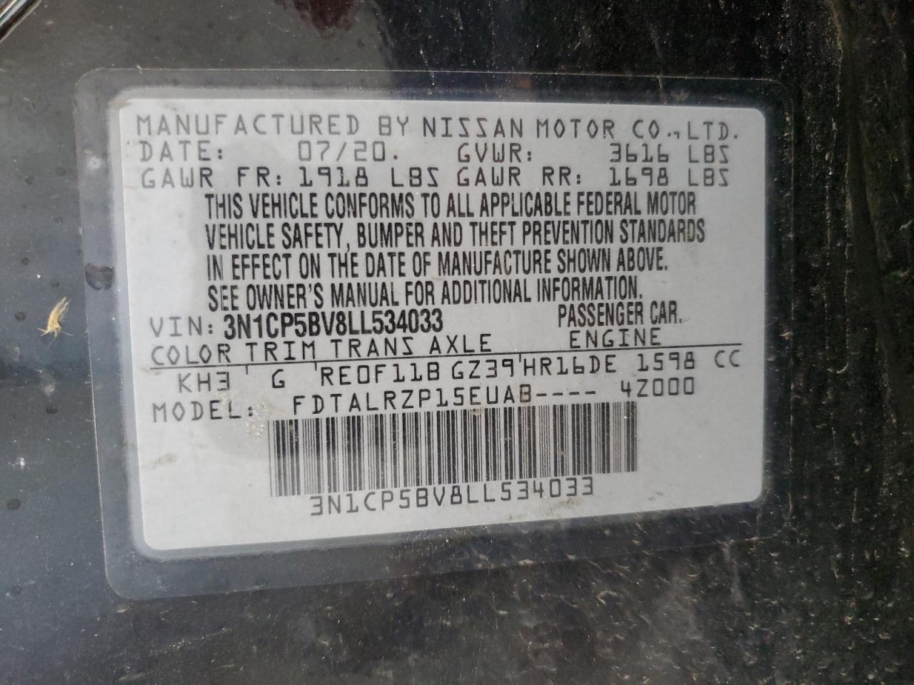 VIN: 3N1CP5BV8LL534033