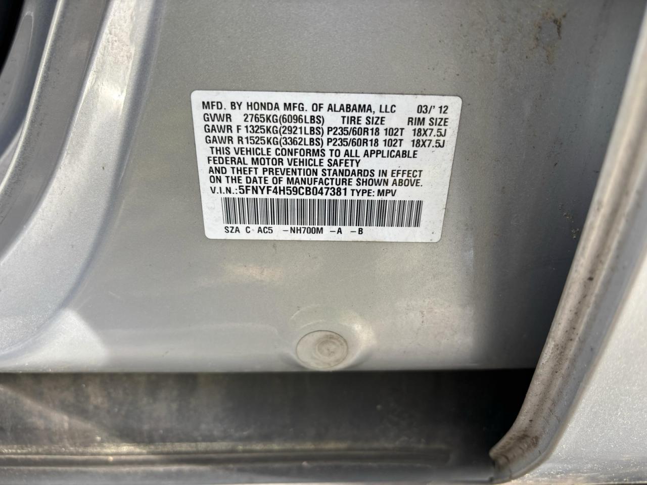 VIN: 5FNYF4H59CB047381