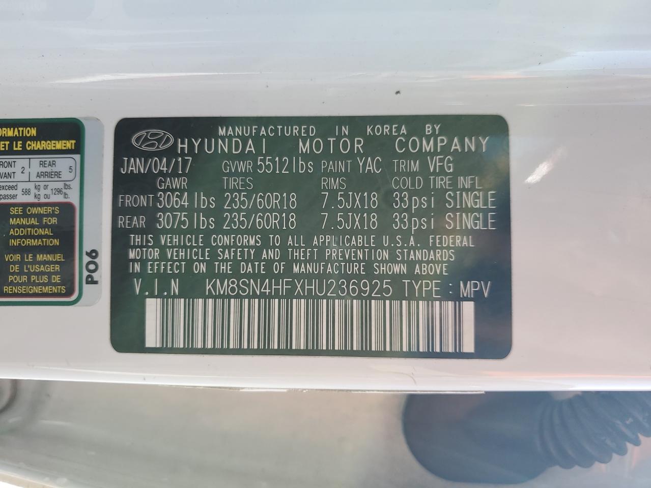 VIN: KM8SN4HFXHU236925