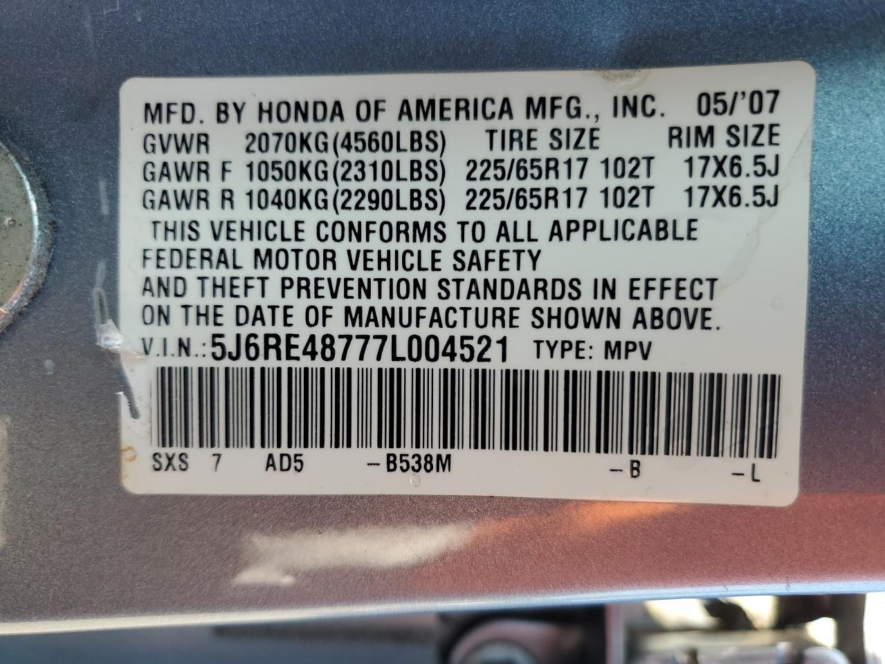 VIN: 5J6RE48777L004521