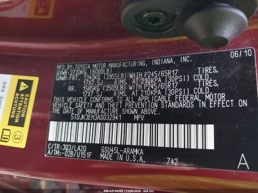 2010 TOYOTA HIGHLANDER SE V6
