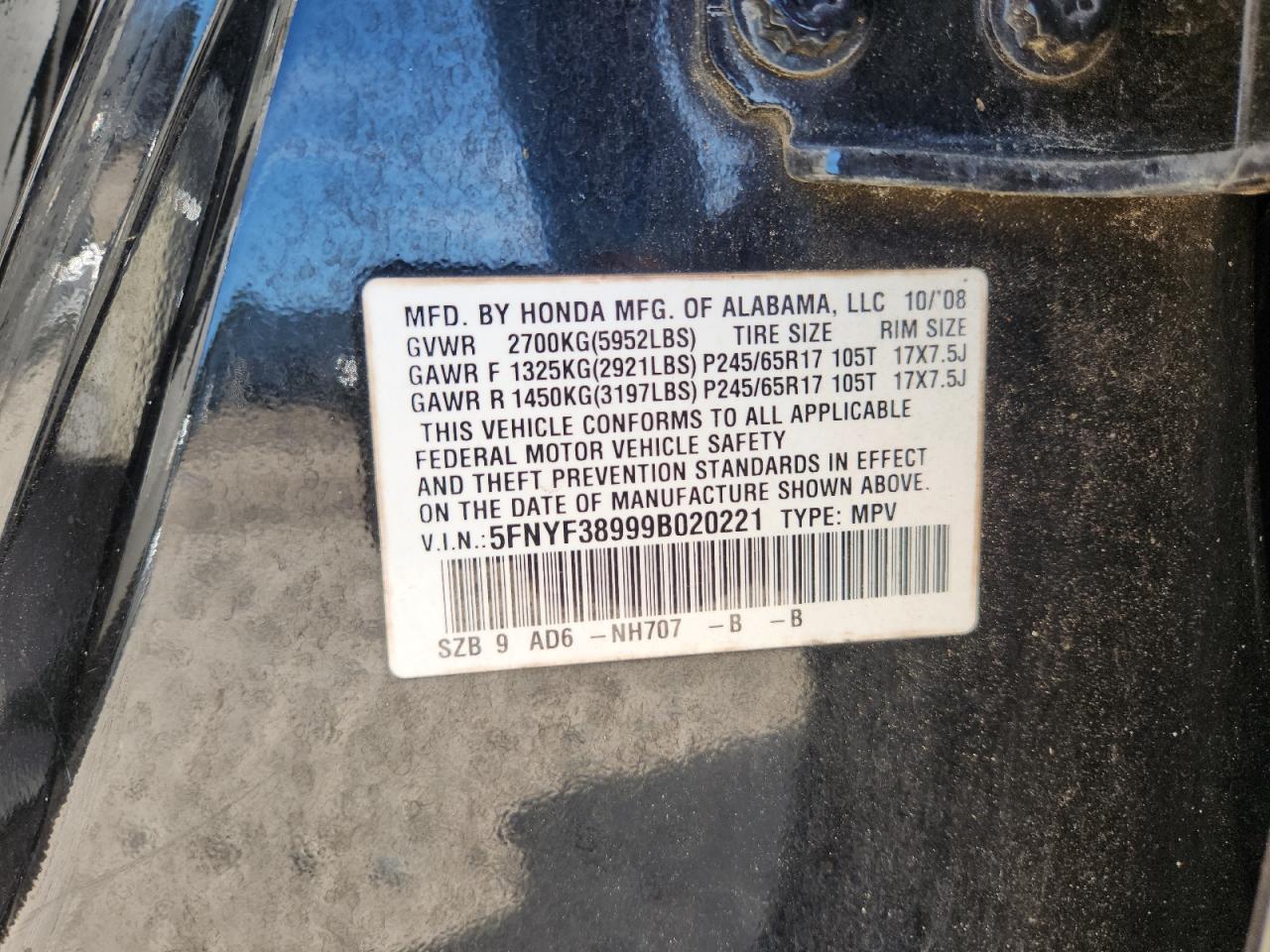 VIN: 5FNYF38999B020221