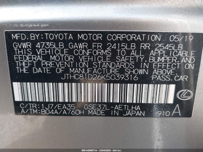 JTHC81D26K5039316
