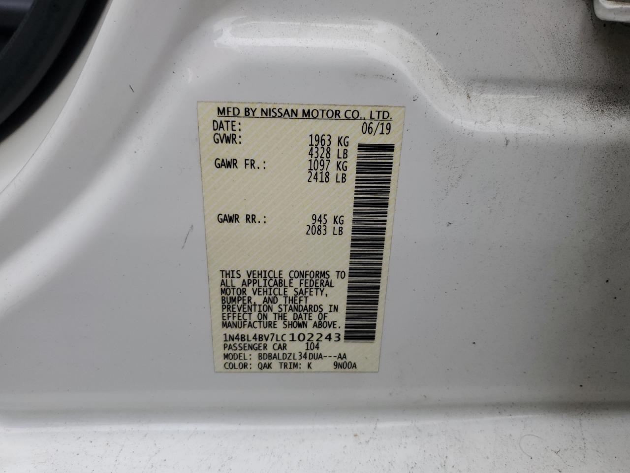 VIN: 1N4BL4BV7LC102243