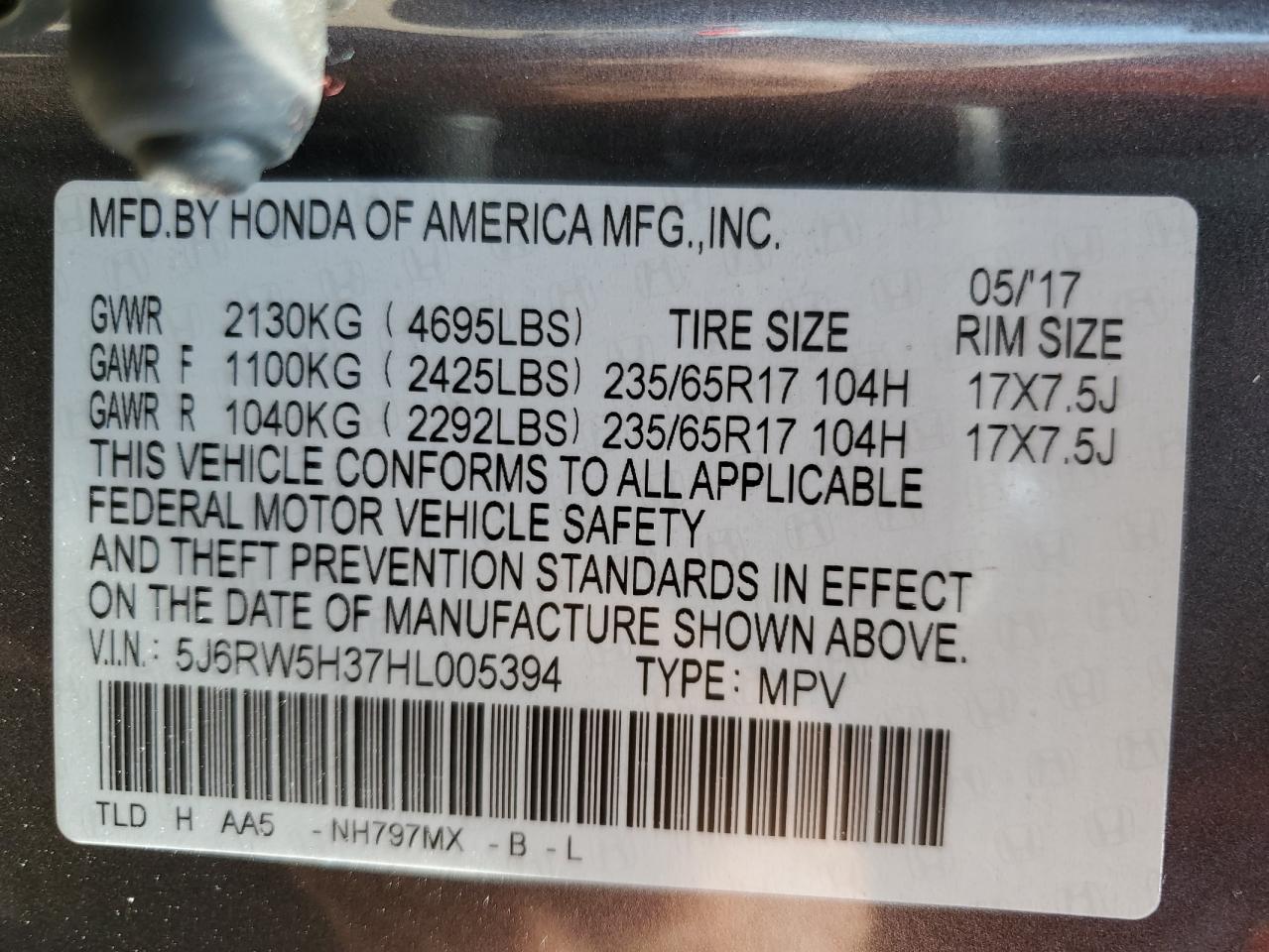 VIN: 5J6RW5H37HL005394