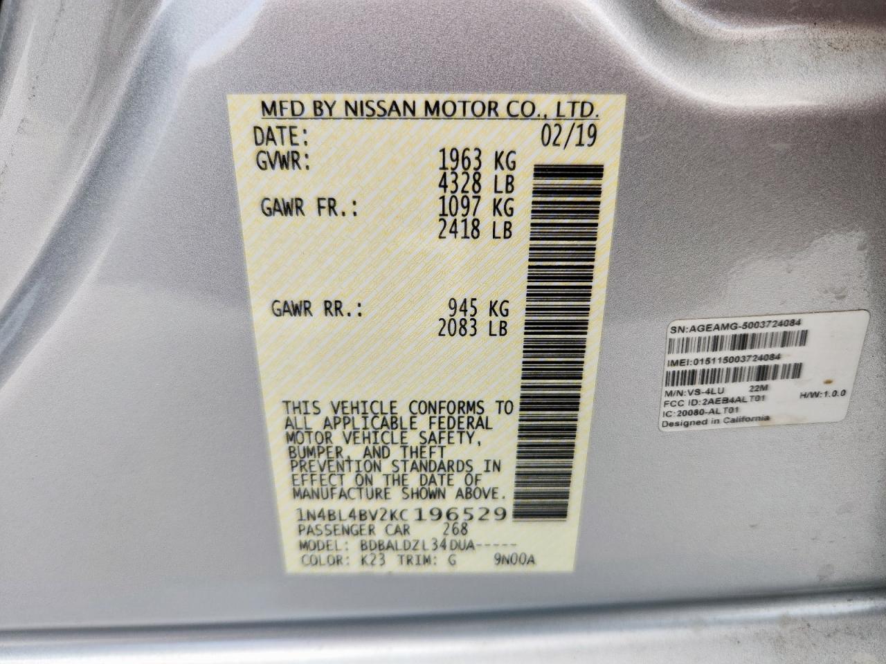 VIN: 1N4BL4BV2KC196529