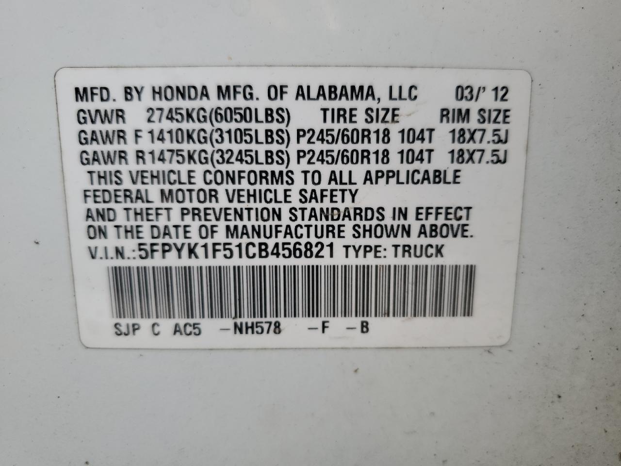 VIN: 5FPYK1F51CB456821