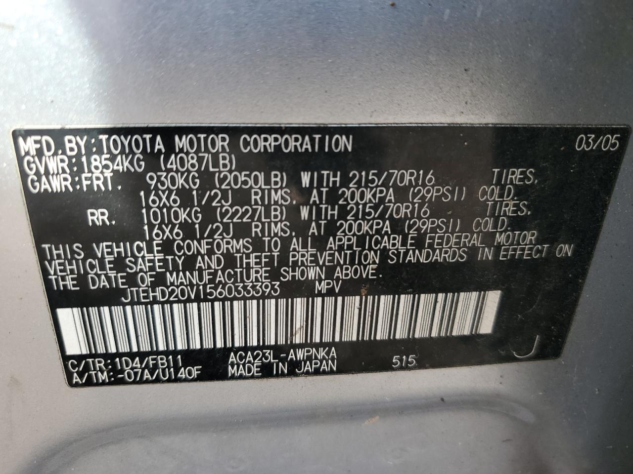 VIN: JTEHD20V156033393