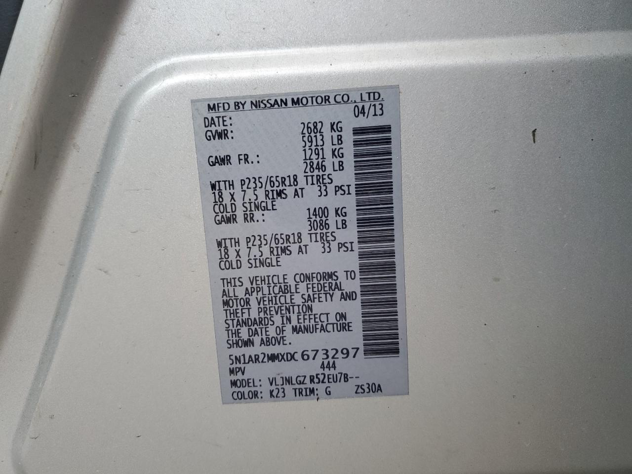 VIN: 5N1AR2MMXDC673297