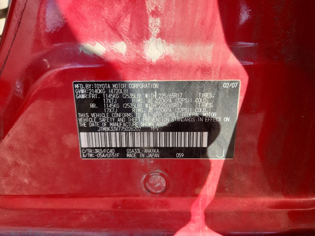 VIN: JTMBK33V775026202
